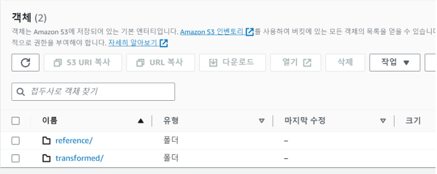 Amazon S3로 이동 후, Cloudformation으로 생성한 {AccountID}-builders-analytics 버킷 안에 두 폴더를 생성합니다.