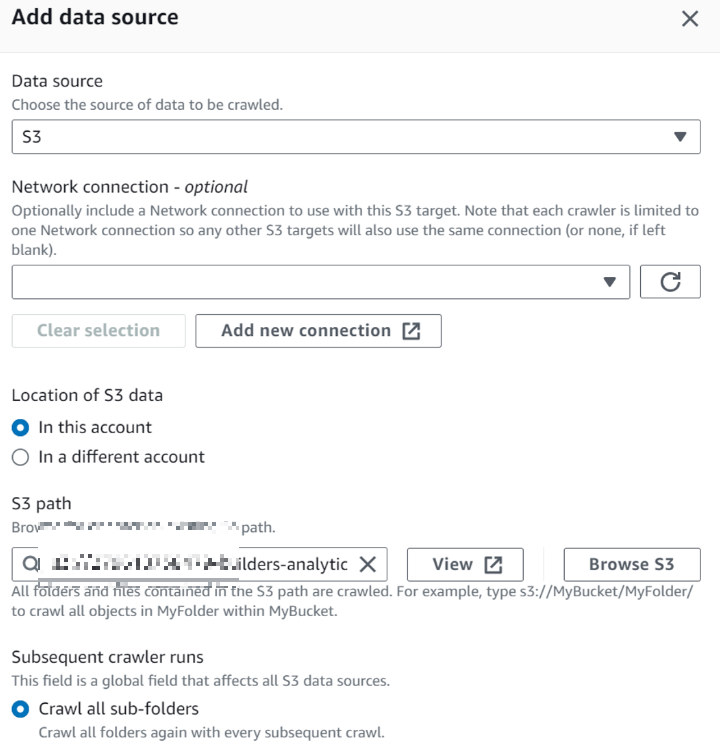 Add a data source > 데이터 소스는 S3로 지정하고, 다음과 같이 설정합니다.