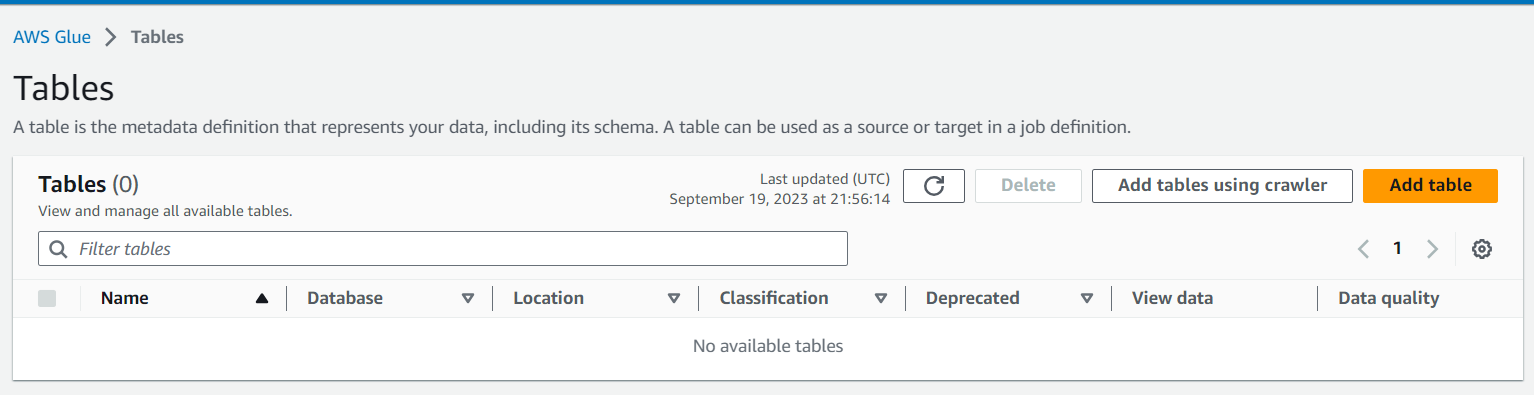 Glue > Data Catalog - Tables > Add Table 과정을 통해 생성합니다.