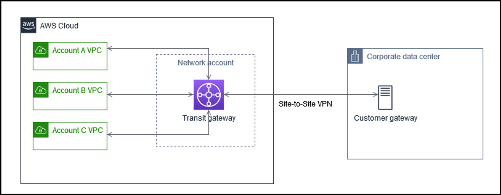 가상 사설 클라우드(VPC)와 온프레미스 네트워크를 상호 연결하는 데 사용할 수 있는 네트워크 전송 허브