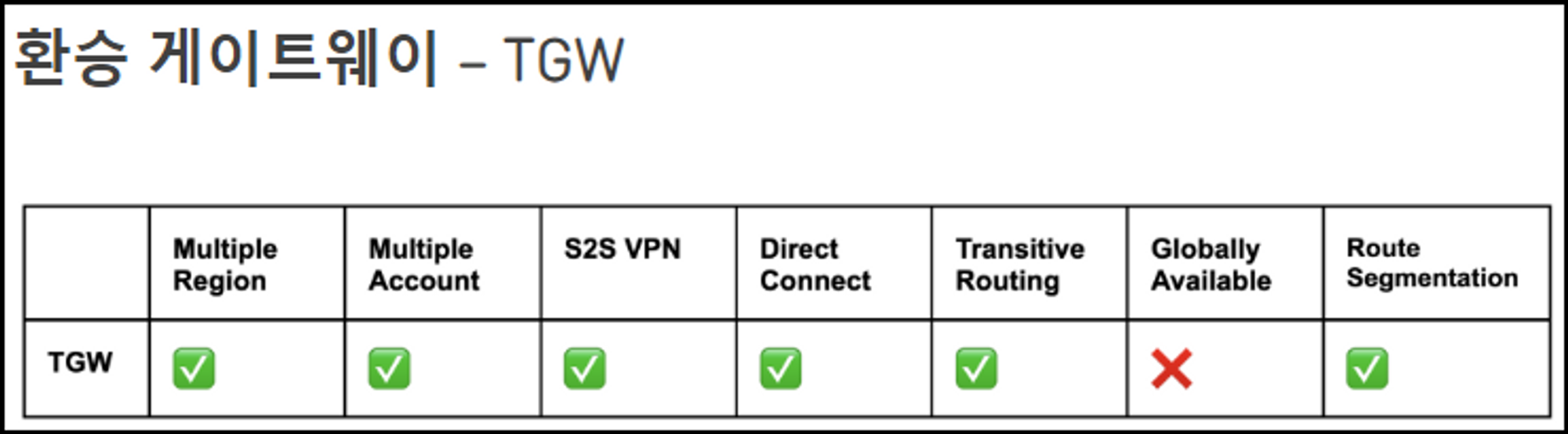 즉, TGW는 여러 VPC 및 다중 AWS 리전 간의 연결을 중앙에서 효율적으로 관리하고 보안성을 강화하는 데에 적합하며,