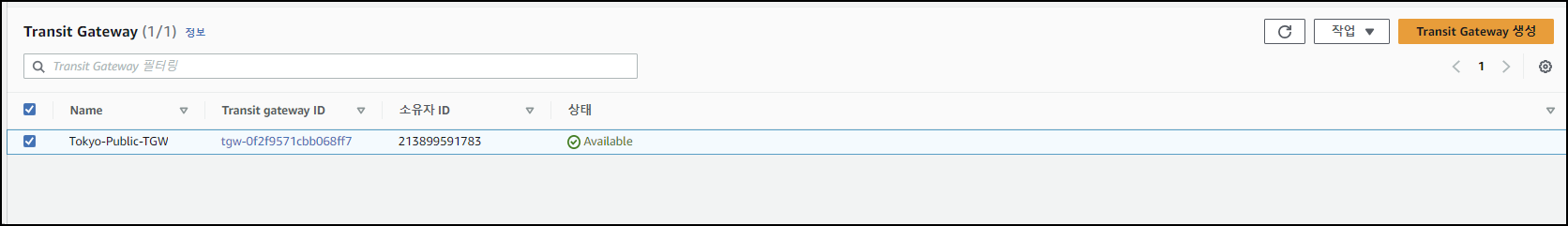 - Attachment type을 Peering Connection 으로 바 연결될 Region을 설정한 후, 해당 TGW ID를 직접 입력후 도쿄 리전의 TGW 연결 탭에 가보면 해당 Attach가 생성되어있음 이후 작업 > Accept > Accept