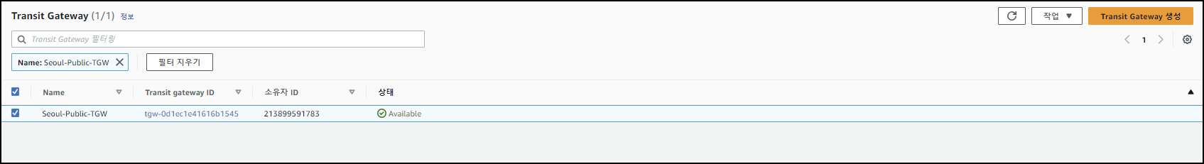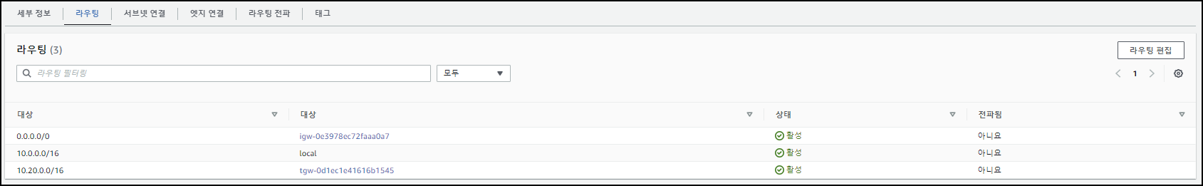 콘솔 > VPC > Transit Gateway 라우팅 테이블