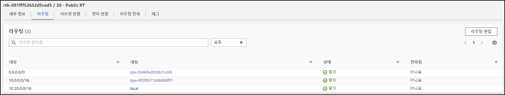 6. 콘솔 > VPC > 라우팅 테이블 > Public RT 선택 > 라우팅 탭 > 라우팅 편집