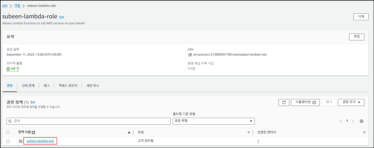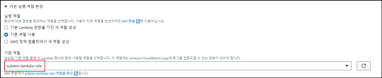 람다 함수 생성시, 역할 → 기존 역할 사용 → subeen-lambda-role을 선택해줍니다.