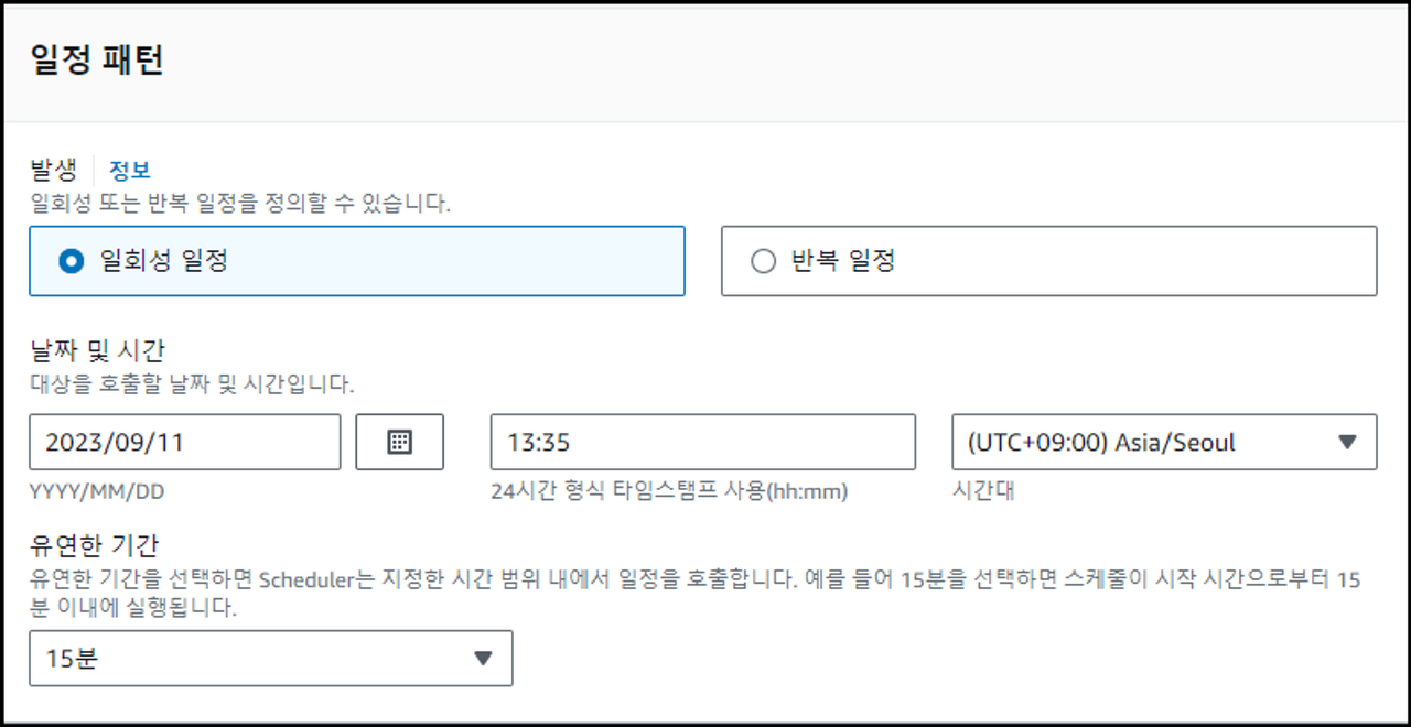 저는 일회성 테스트를 위해 ‘일회성 일정’을 선택하였지만,