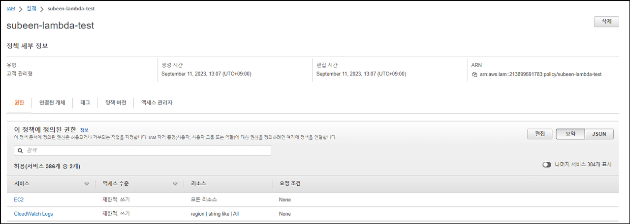 : AWS Console → IAM → 정책 → 정책생성 → JSON