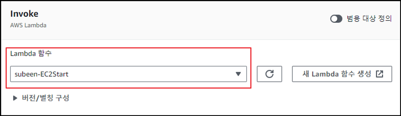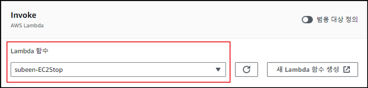 AWS Lambda - Invoke를 선택한 후, 만들어뒀던 Lambda의 Stop, Start 함수들을 사용합니다.