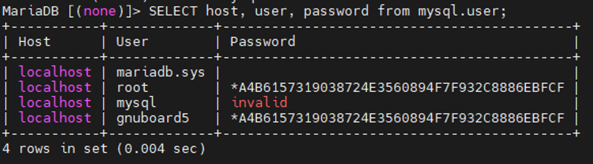 SHOW GRANTS FOR 'gnuboard5'@'localhost';