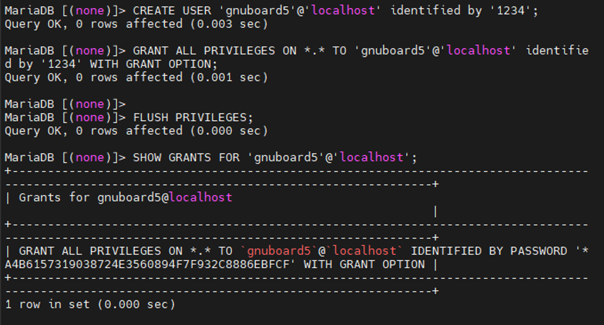 GRANT ALL PRIVILEGES ON *.* TO 'gnuboard5'@'localhost' identified by '1234' WITH GRANT OPTION;