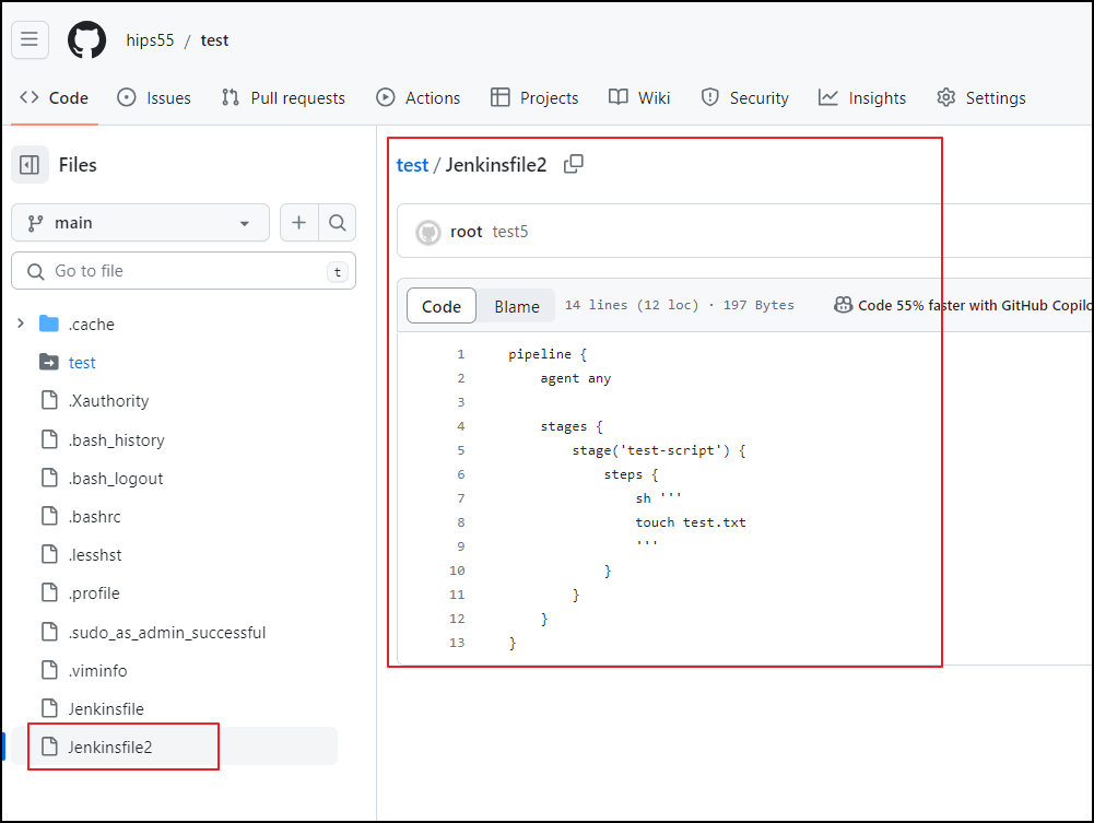 간단하게 파일 하나 생성하는 jenkinsfile 을 생성하여 테스트 해보겠습니다.