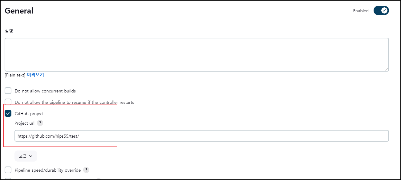 해당 값으로 설정하면 Webhook 설정이 되어서 해당 레포지토리에 push가 일어나면 자동으로 Jenkins 파이프라인이 동작합니다