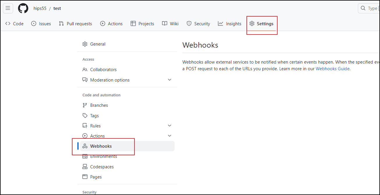 파일을 업로드할 Git Repo 의 설정으로 들어가 Webhook 설정을 해 줍니다.