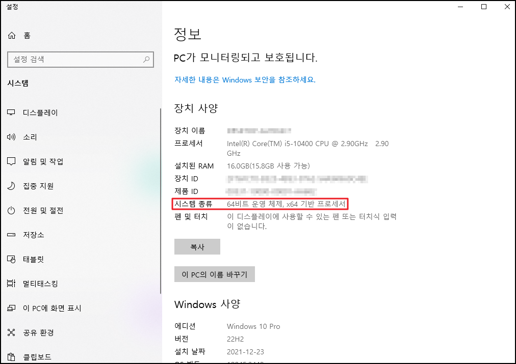 2. 제어판 > 시스템 및 보안 > 시스템을 통해 확인합니다.