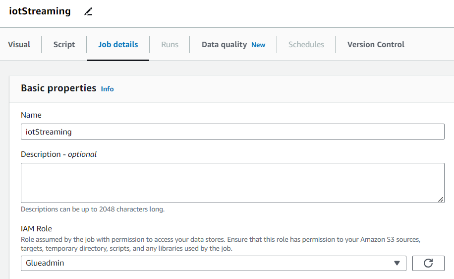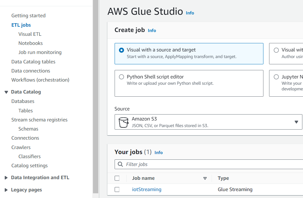 데이터 처리를 위한 사전 작업을 진행했고, streaming job을 생성하는 것으로 이어서 진행합니다. (2. Glue Streaming)