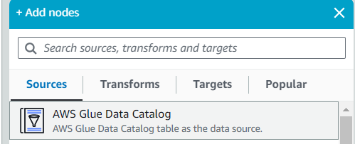 sources > AWS Glue Data Catalog를 선택합니다.