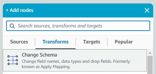 add nodes(좌측 위 +)를 눌러 Transforms > Change Schema을 선택합니다.