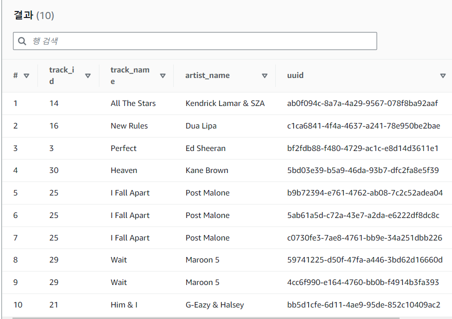 쿼리 결과에서 track_name과 artist_name이 추가 된 것을 확인할 수 있습니다.