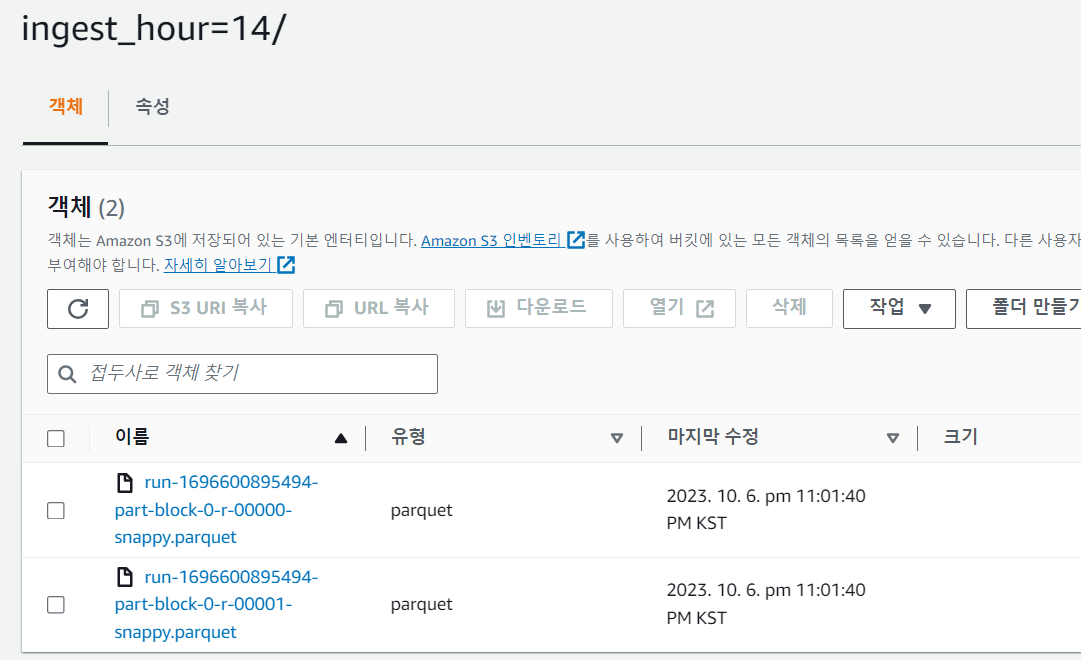 Amazon S3에서 ETL이 완료된 데이터들이 정상적으로 저장된 것을 확인할 수 있습니다.