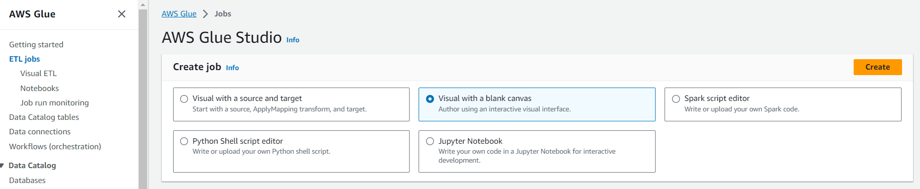 Glue > ETL jobs 선택 후 Visual with blank canvas로 생성합니다.