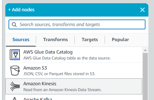 Glue Job을 시각화로 생성하는 메뉴로 이동했다면, 우선 kinesis부터 설정합니다.