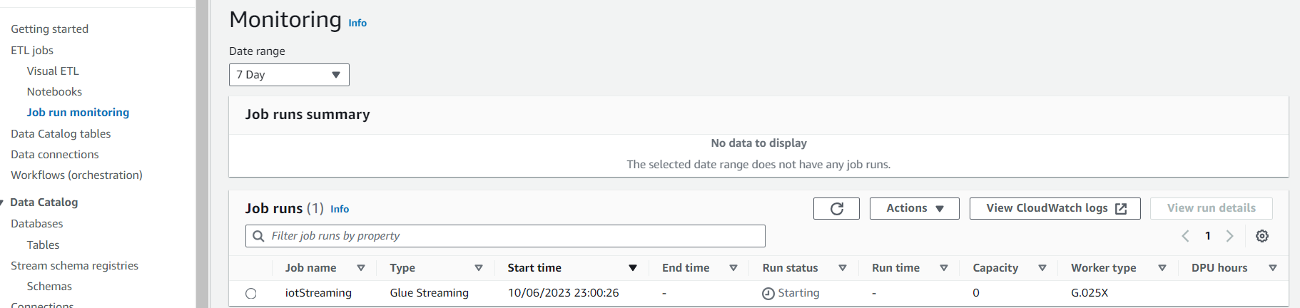 Job run monitroing 메뉴를 통해서 Glue Streaming Job의 상태를 확인 할 수 있습니다.