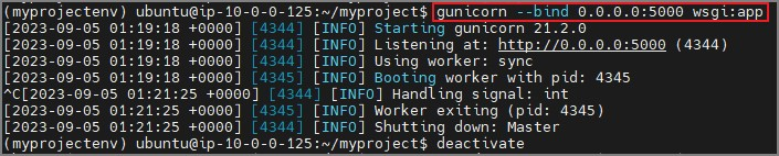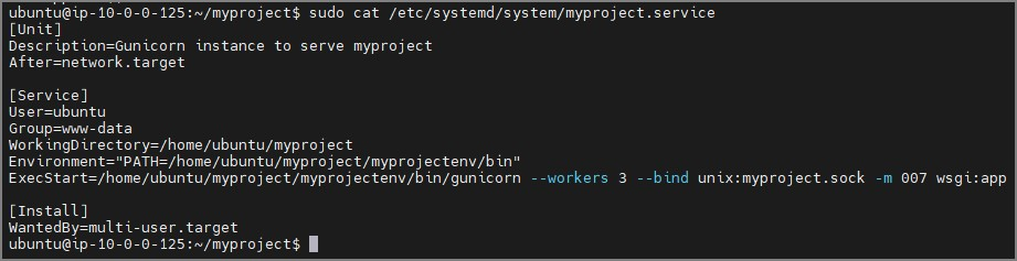 ExecStart=/home/ubuntu/myproject/myprojectenv/bin/gunicorn --workers 3 --bind unix:myproject.sock -m 007 wsgi:app
