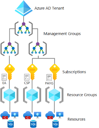 Azure는 Azure 리소스 구성을 위한 4가지 관리 수준 또는 4가지 범위 수준( 관리 그룹, 구독, 리소스 그룹 및 리소스)을 제공합니다. 위의 이미지는 이러한 수준 간의 관계를 보여줍니다.