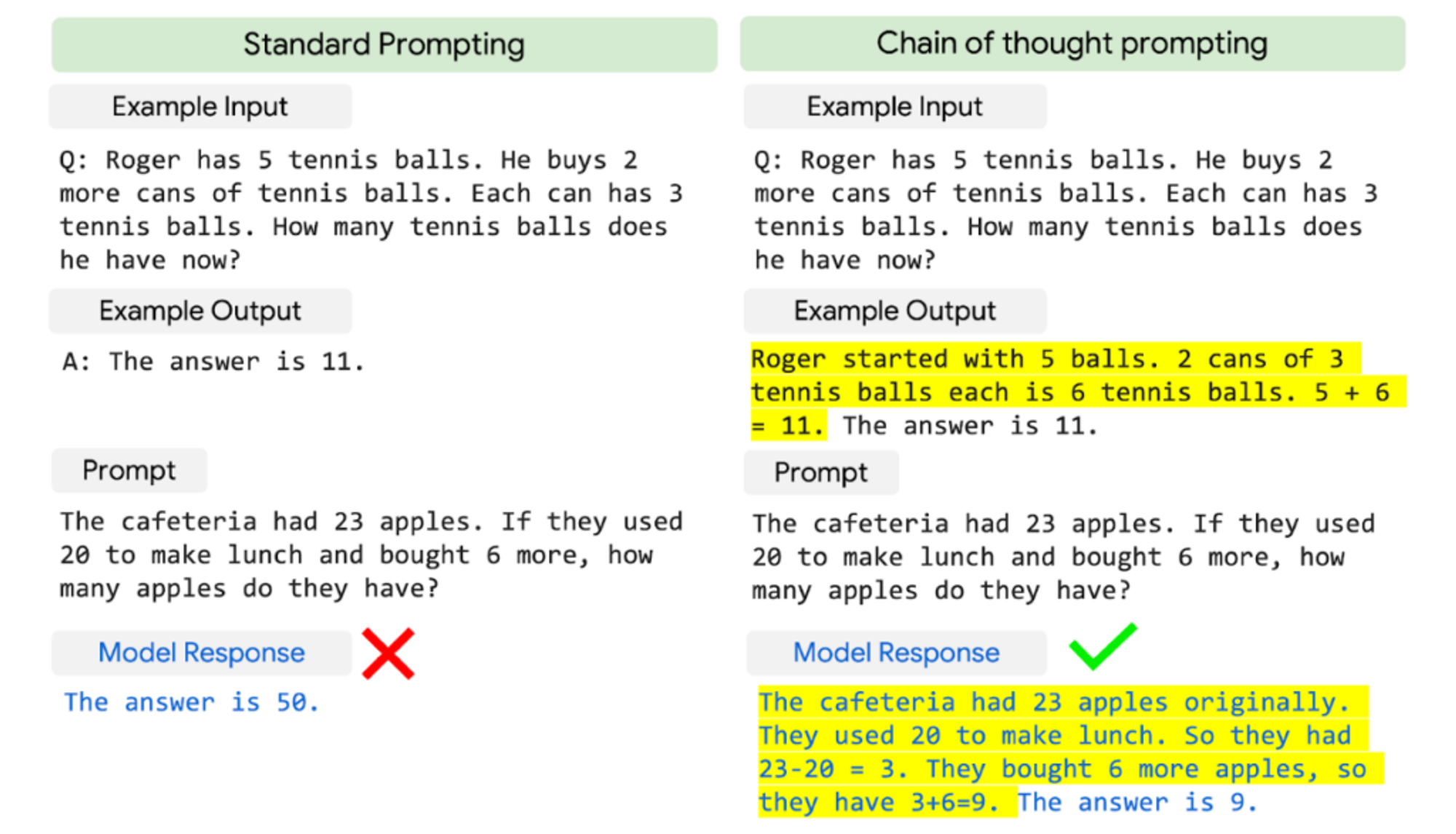 - 아래의 이미지는 PaLM이 사고 사슬을 이용해 초등학교 수학 문제를 해결하는 예시이다. 왼쪽은 일반적인 프롬프트이고, 오른쪽은 사고 사슬을 이용한 프롬프트이다. PaLM은 문제를 정확히 맞출 뿐 아니라 정답의 이유까지 명확하게 제시하고 있음