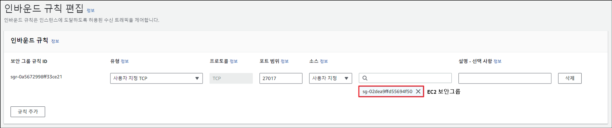 : EC2와 document db가 통신이 가능하도록 27017번 포트 오픈