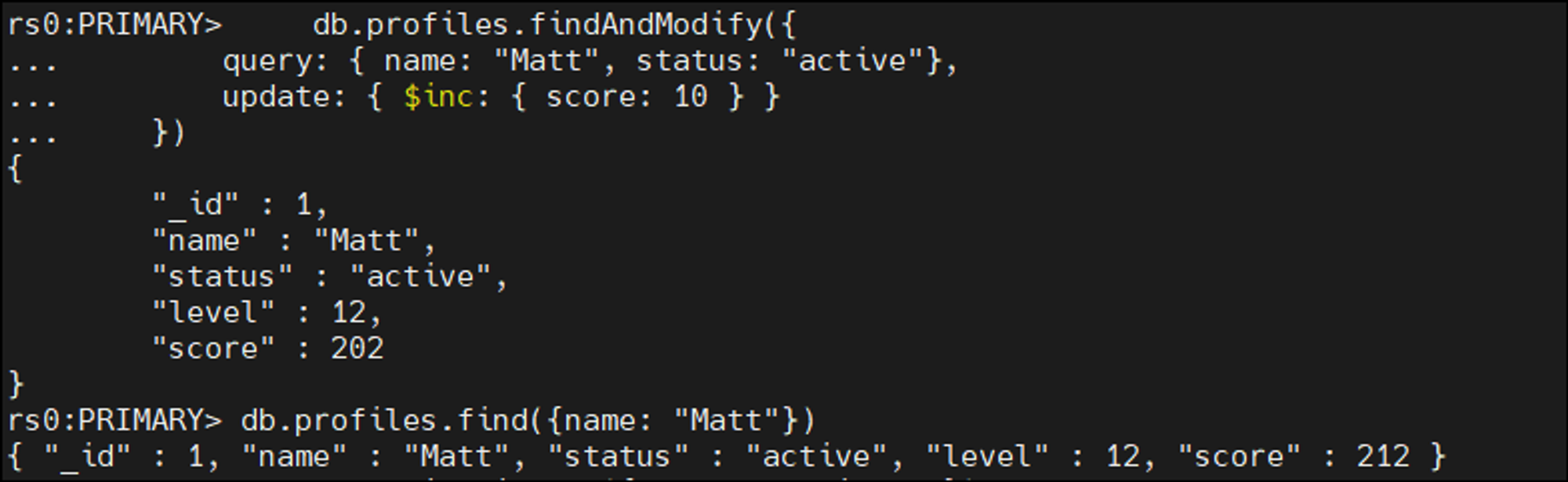 { "_id" : 1, "name" : "Matt", "status" : "active", "level" : 12, "score" : 202 }