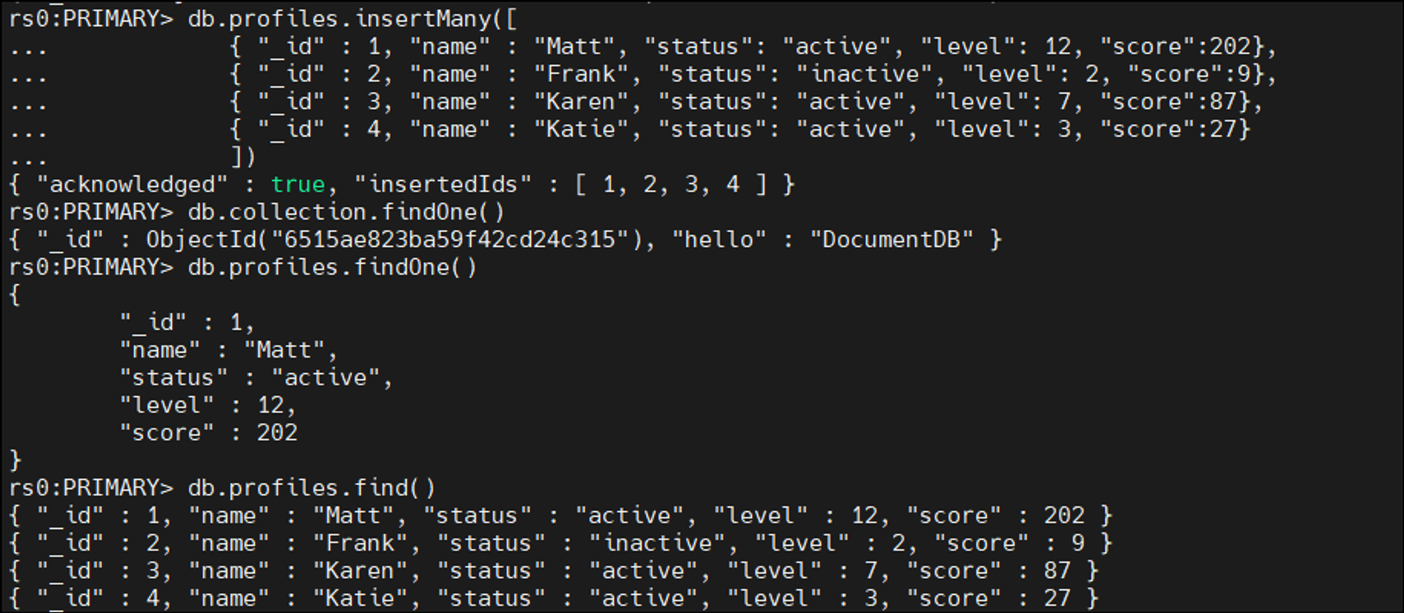 { "_id" : ObjectId("6515ae823ba59f42cd24c315"), "hello" : "DocumentDB"