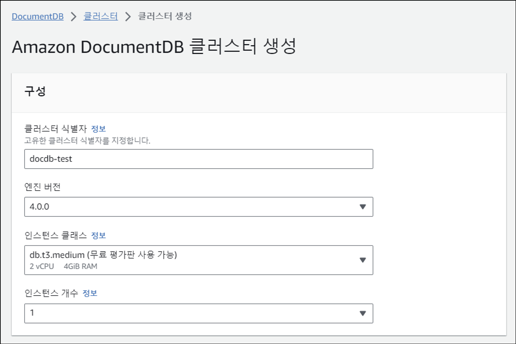 저는 테스트를 위해 우선은 default VPC에 DocumentDB와 EC2를 만들어서 진행했습니다.