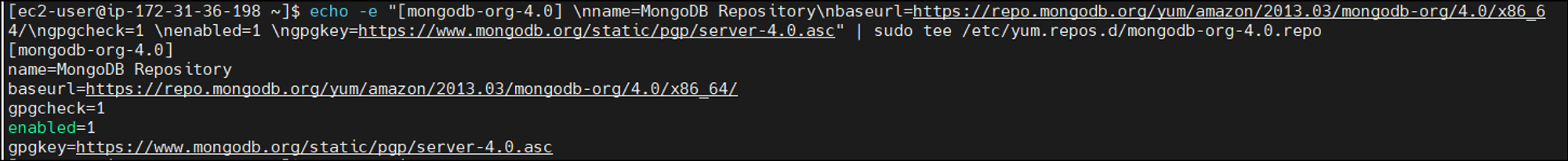 echo -e "[mongodb-org-4.0] \nname=MongoDB Repository\nbaseurl=https://repo.mongodb.org/yum/amazon/2013.03/mongodb-org/4.0/x86_64/\ngpgcheck=1 \nenabled=1 \ngpgkey=https://www.mongodb.org/static/pgp/server-4.0.asc" | sudo tee /etc/yum.repos.d/mongodb-org-4.0.repo