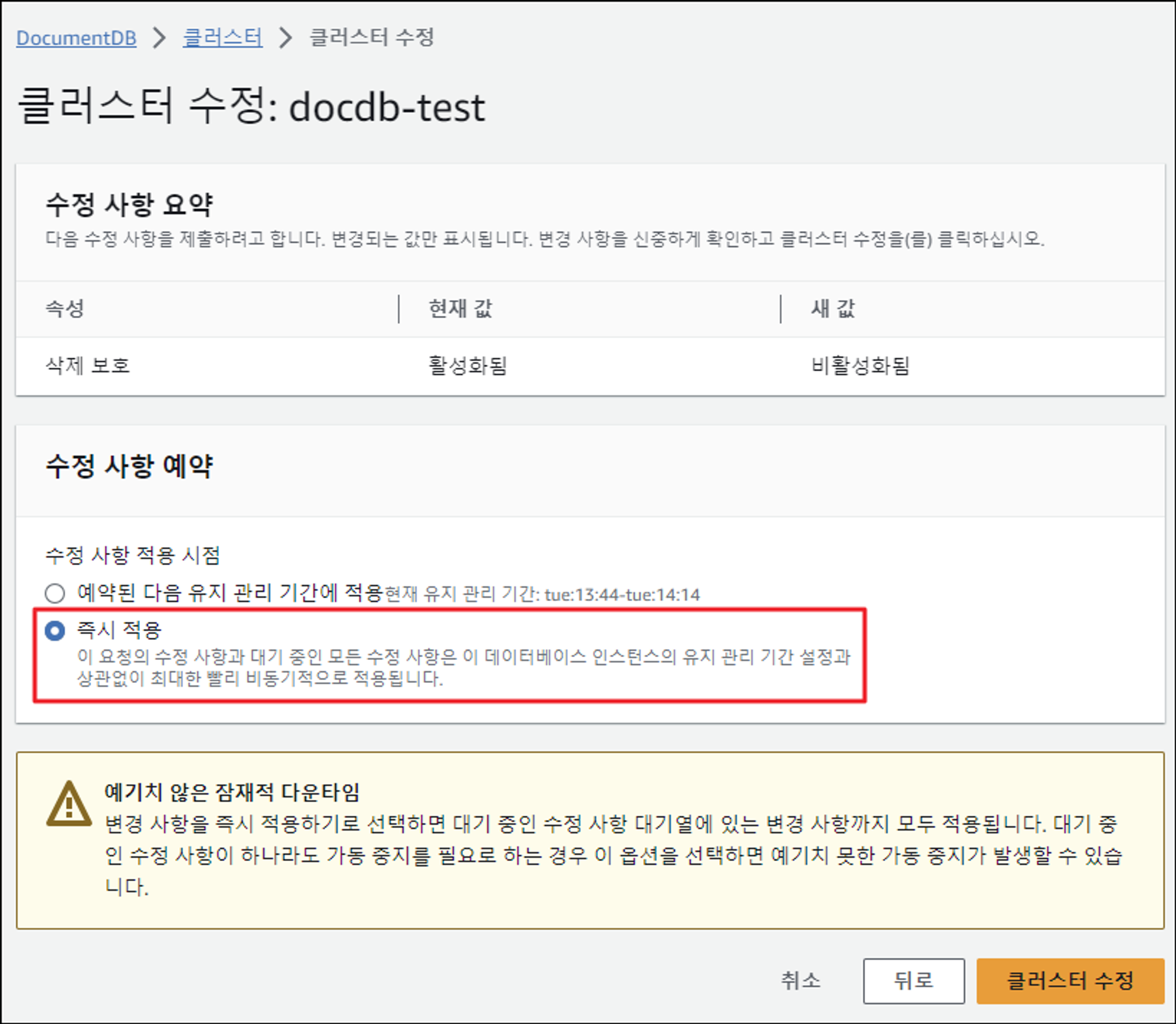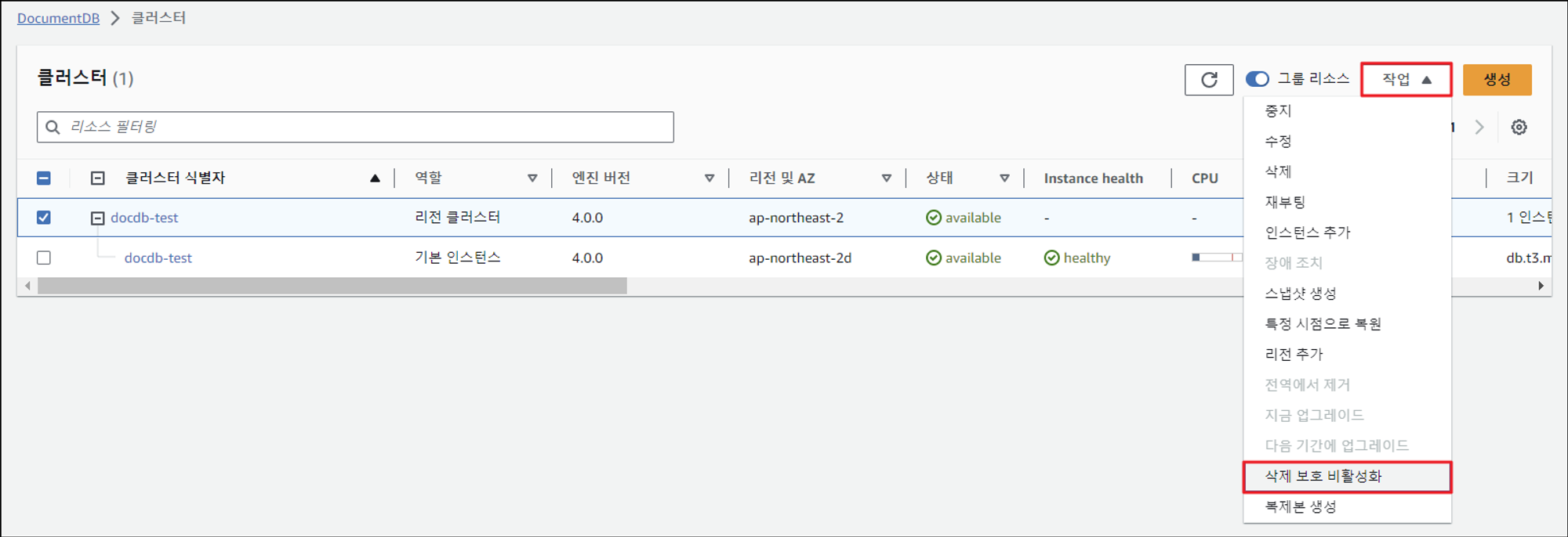 : RDS와는 다르게 Document DB에는 기본적으로 “삭제 보호”가 활성화 되어 있습니다.