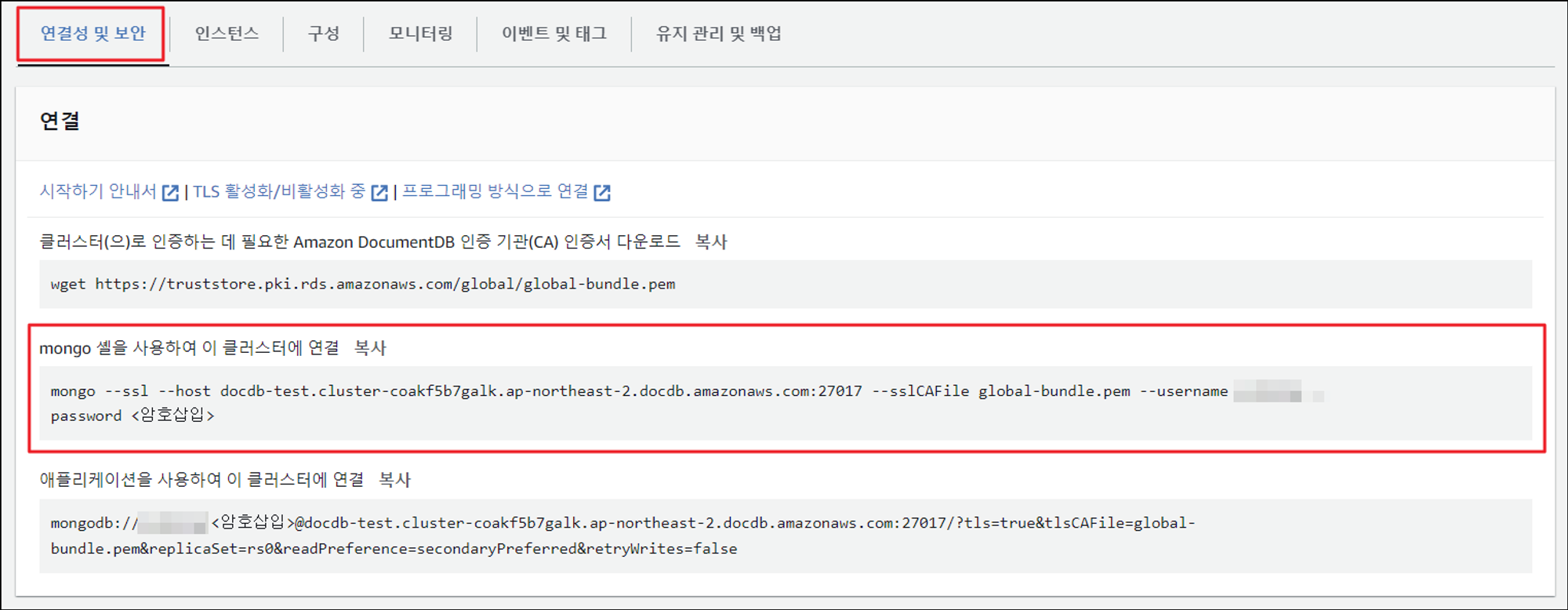: AWS Document DB > 클러스터 선택 > 연결성 및 보안 > 클러스터 엔드포인트 확인