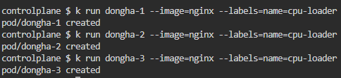 k run dongha-3 --image=nginx --labels=name=cpu-loader