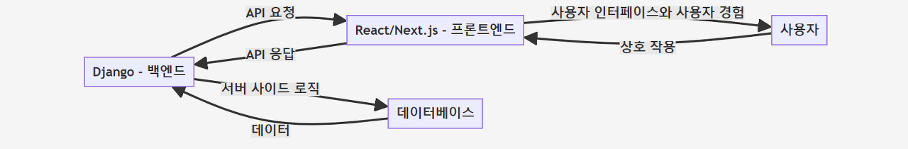 프론트엔드(React)가 Django 백엔드로 API 요청을 보내면, 장고는 요청을 서버 사이드 로직에 따라 처리하여