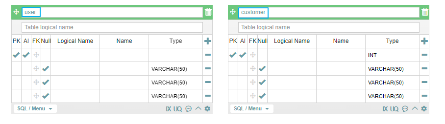 테이블에 user와 customer라는 이름을 적어볼게요.