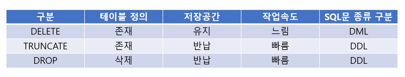 - 기존 테이블의 존재를 없앤다.(테이블의 정의 자체를 완전히 없앤다.)
