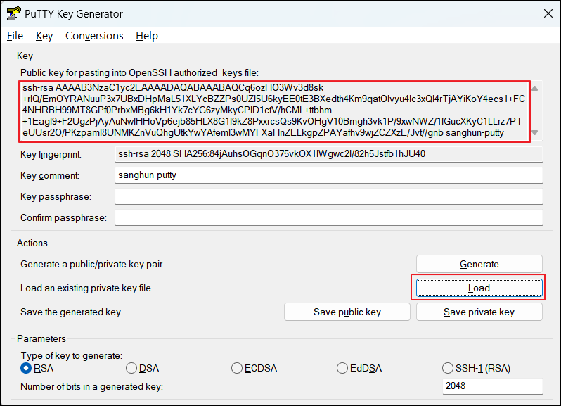 1) Load 버튼을 누른 후 이전에 생성한 새로운 키페어(sanghun-putty.ppk)를 Load