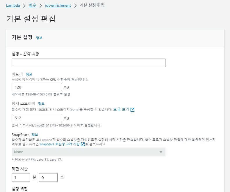 Lambda 일반 구성 설정 화면으로 이동하여 제한 시간을 1분으로 변경하고,