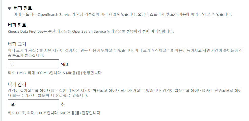 Opensearch에 데이터를 저장하기 위한 버퍼를 설정하기 위해 버퍼 힌트를 클릭합니다.