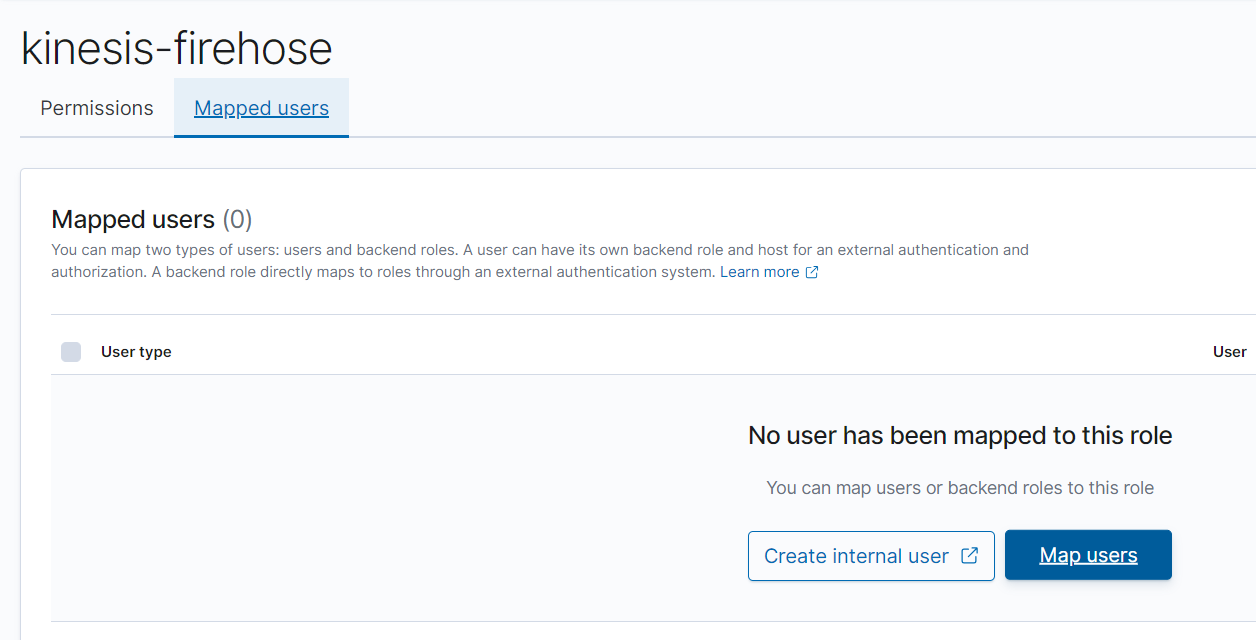 Role을 생성한 후 해당 Role에 Kinesis Data Firehose를 매핑시켜주기위해 Mapped users를 클릭합니다.