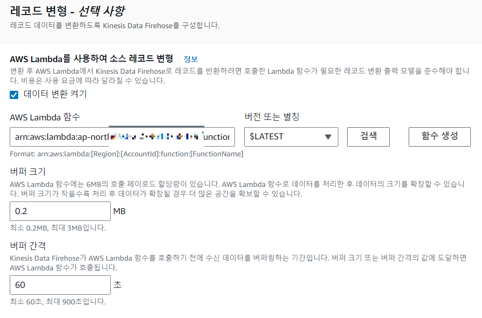 레코드 변형 메뉴에서 'AWS Lambda를 사용하여 소스 레코드 변형'에 데이터 변환 활성화를 클릭합니다.