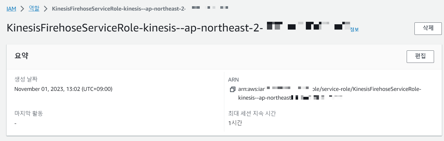IAM 메뉴에서 Kinesis Firehose에 적용된 IAM의 ARN 정보를 복사해둡니다.