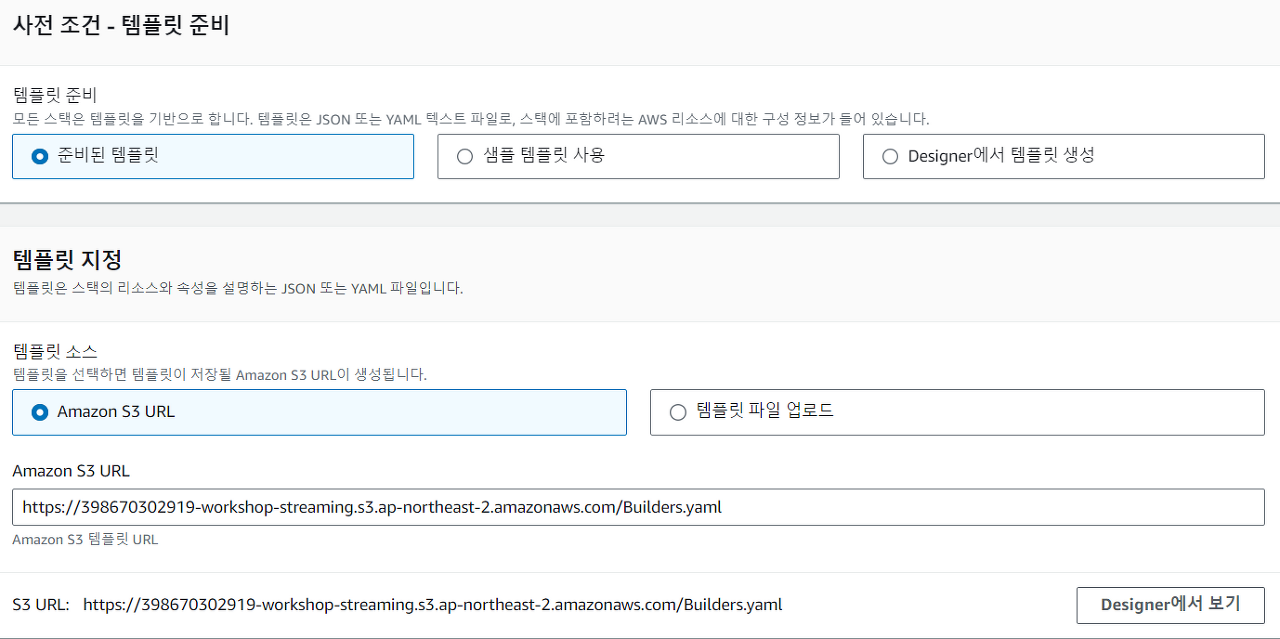 템플릿 소스는 S3 URL로 지정, AWS workshop에서 제공된 URL를 이용합니다.