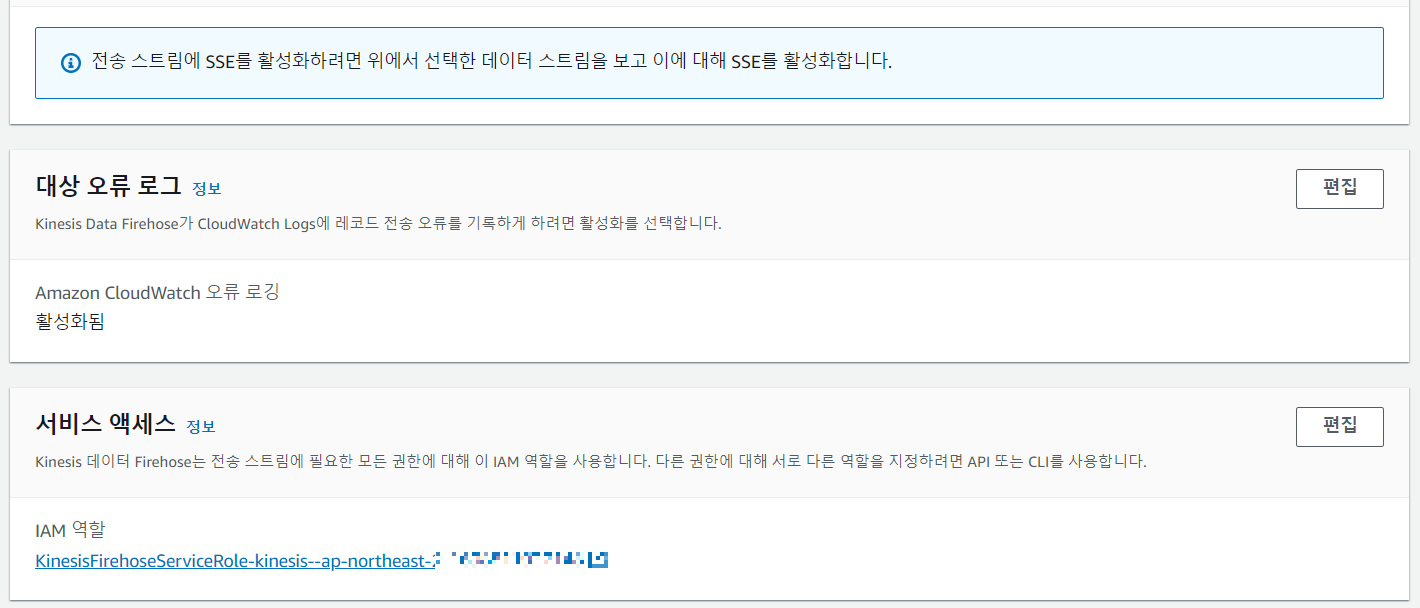 앞서 생성한 kinesis-opensearch의 구성 탭 하단의 서비스 액세스 박스에서 IAM 역할을 클릭,