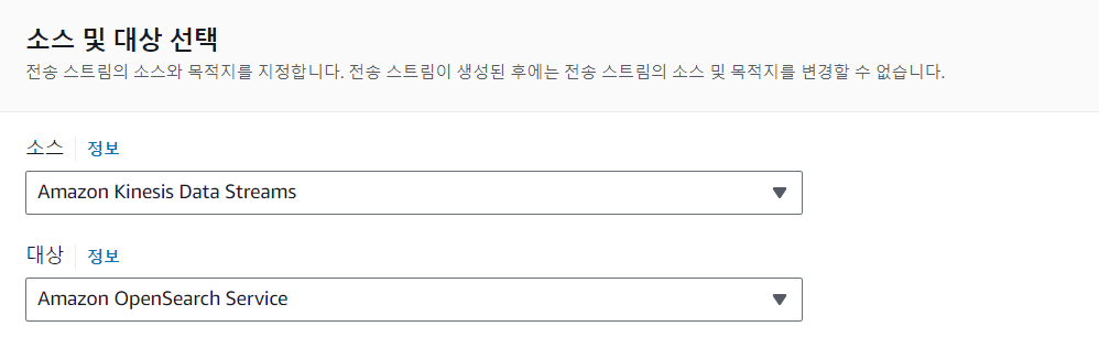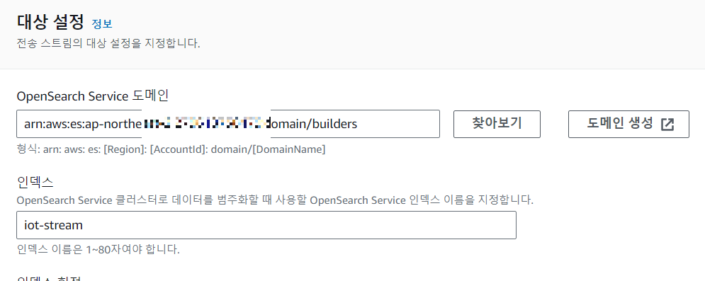 데이터가 저장 될 대상 설정에서 Cloudformation으로 생성한 opensearch 도메인을 클릭합니다.