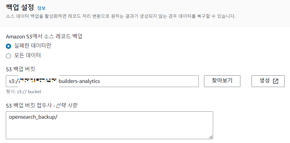 S3 백업 버킷으로는 Cloudformation으로 생성한 버킷을 선택하고, 버킷 접두사로 opensearch_backup/을 입력합니다.